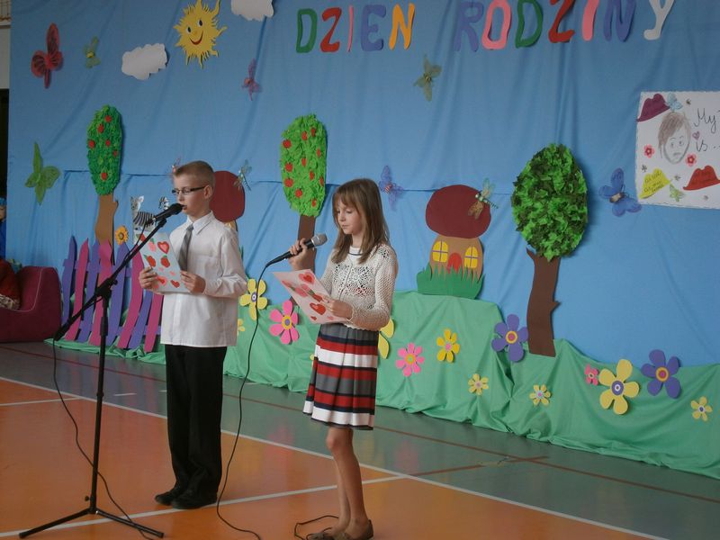 Pani Dyrektor Bożena Świętek powitała zebranych Gości oraz złożyła życzenia Rodzicom i Dzieciom z okazji Dnia Rodziny. Dzieci z oddziału przedszkolnego przebrane za kwiatki, motylki, pszczółki, bociany i żabki pod kierunkiem p. Anny Rzeszótko przedstawiły montaż słowno – muzyczny „Na majowej łące” oraz zatańczyły dostojnie poloneza. Uczniowie klas I-IV przygotowali humorystyczne przedstawienie pt. „Zamieszanie w krainie bajek”. Największą furorę zrobiły niezaprzeczalnie złe wróżki. Następnie odbył się muzyczny koncert dla Rodziców i pozostałych Gości. Uczniowie klasy III zaśpiewali piosenki skierowane do najukochańszej osoby-Mamy. Dzieci z klasy I i II przygotowane przez p. Sylwię Lisowską i p. Jolantę Polczyk z użyciem kolorowych rekwizytów radośnie śpiewały piosenki po angielsku i w języku ojczystym. Uczniowie klas starszych dali pokaz swoich nieprzeciętnych umiejętności muzycznych śpiewając solo i w chórze oraz grając na wykonanych przez siebie instrumentach perkusyjnych - kolorowych grzechotkach. Koncert uświetniła uczennica z klasy VI Barbara Kucaba, grając utwory muzyczne na organach elektronicznych pod kierunkiem Barbary Czaja.