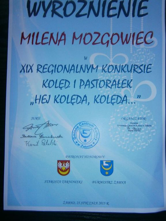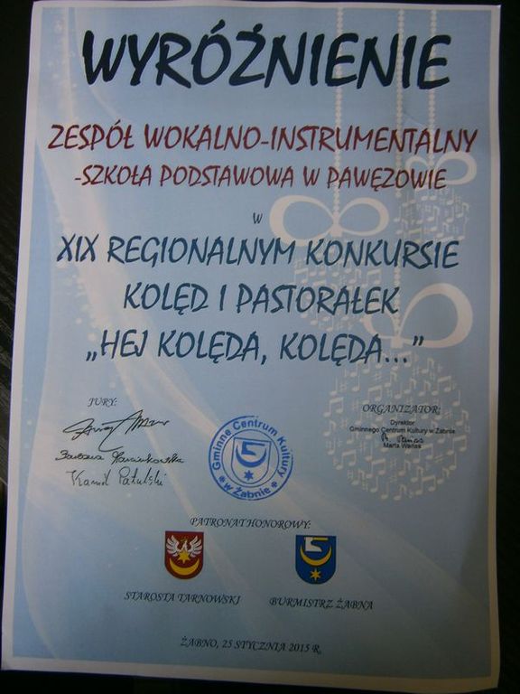 20 stycznia 2015 roku w Gminnym Centrum Kultury w Żabnie odbył się XIX Regionalny Konkurs Kolęd i Pastorałek. Wystąpili w nim uczniowie naszej szkoły.