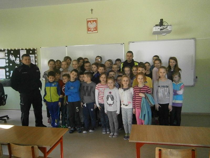 13 lutego 2015 roku w naszej szkole gościliśmy policjantów, na czele z dzielnicowym, Panem Ryszardem Prusakiem, którzy zaapelowali do dzieci i młodzieży o bezpieczeństwo podczas zimowej przerwy. Zwrócili uwagę na skutki niewłaściwych i niebezpiecznych zachowań. Podkreślali wagę odpowiedniego zachowania się w różnych miejscach związanych z miejscami zimowych zabaw, zwłaszcza tych znajdujących się blisko jezdni. W pogadance nawiązali również do zagrożeń wynikających z nadmiernego użytkowania Internetu i portali społecznościowych, nie zawsze przeznaczonych dla dzieci. Przypomnieli, że za czyny osób nieletnich odpowiadają rodzice.
