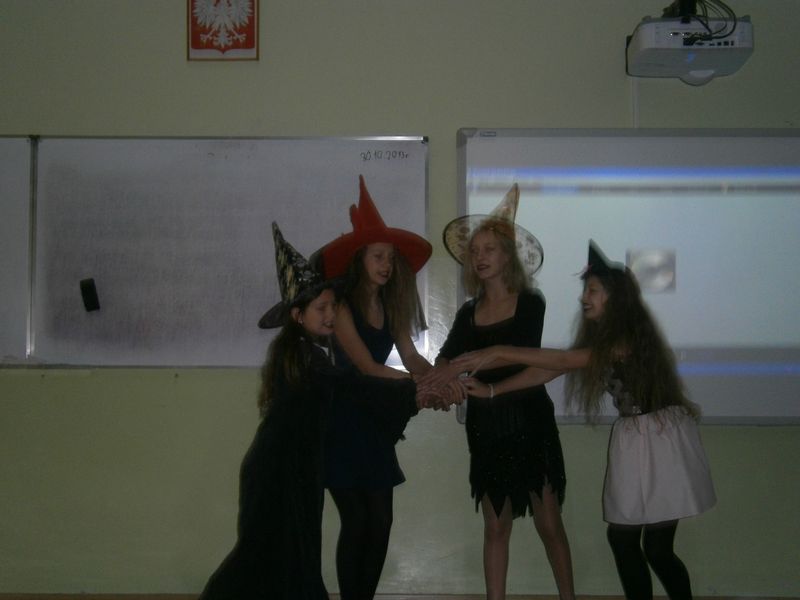 W dniu 30 października nasza szkoła została na chwilę opanowana przez wiedźmy, duchy, wampiry oraz inne szkarady. Wszystko to za sprawą uczniów z klas IV-VI uczęszczających na cotygodniowe zajęcia teatralne. Tym razem nasi aktorzy zaprezentowali krótką, ale jakże wymowną inscenizację na temat święta Halloween, które to wywodzi się od Celtów i jest najhuczniej obchodzone w Stanach Zjednoczonych, Kanadzie, Irlandii i Wielkiej Brytanii. Za pomocą wielobarwnych kostiumów, rekwizytów a także odpowiedniej charakteryzacji pozostała część dzieci uczestniczyła w „żywej” lekcji kulturowej. W ten oto zabawny sposób wszyscy nasi uczniowie zapoznali się z tradycjami i zwyczajami panującymi w krajach anglojęzycznych, a także wzbogacili słownictwo związane z tą tematyką. Po części artystycznej nasze przeurocze czarownice zadbały o nasze żołądki, częstując paluchami wiedźmy (witches fingers) oraz kostkami „bones”, które pomimo przerażającego wyglądu, zostały zjedzone do ostatniego.