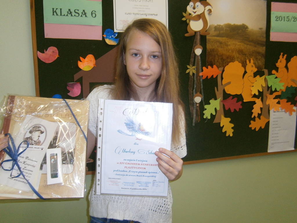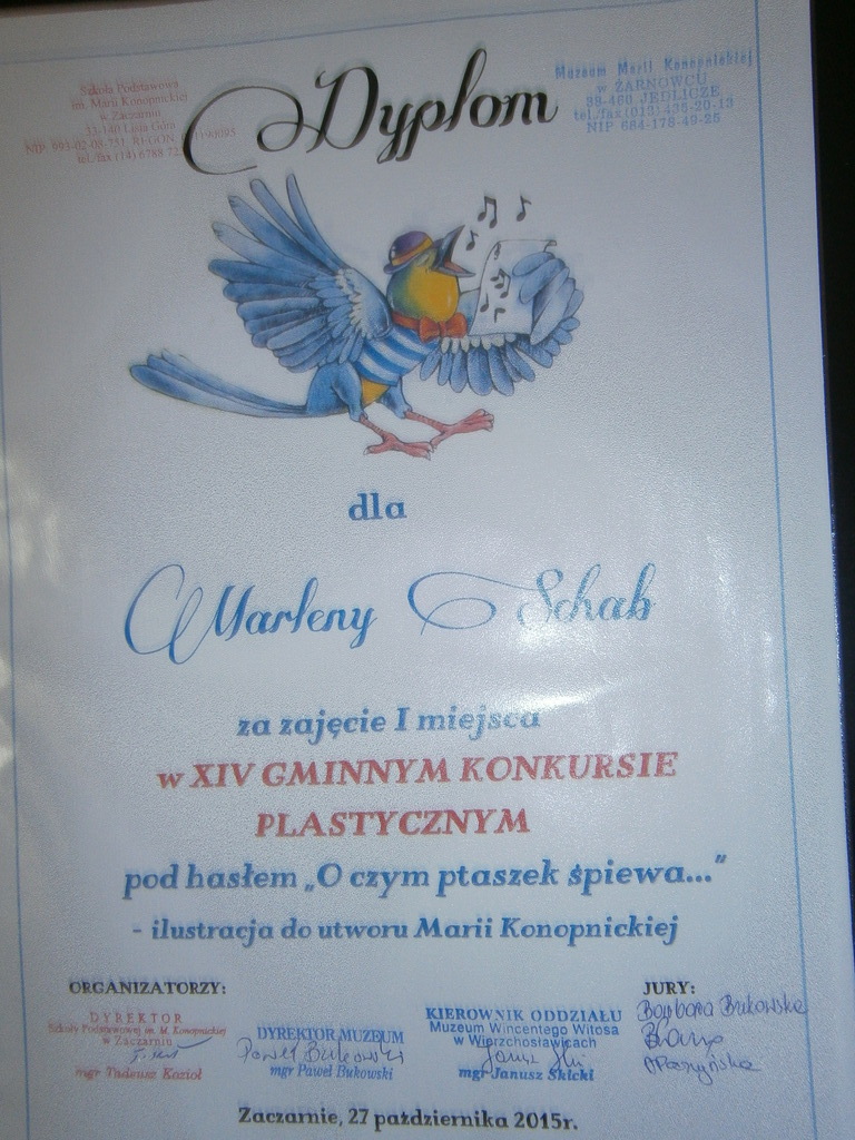 Nasza uczennica Marlena Schab z klasy 6 zajęła I miejsce w kategorii klas IV-VI - otrzymując dyplom i nagrodę. Serdecznie gratulujemy Marlenie i życzymy dalszych sukcesów artystycznych.