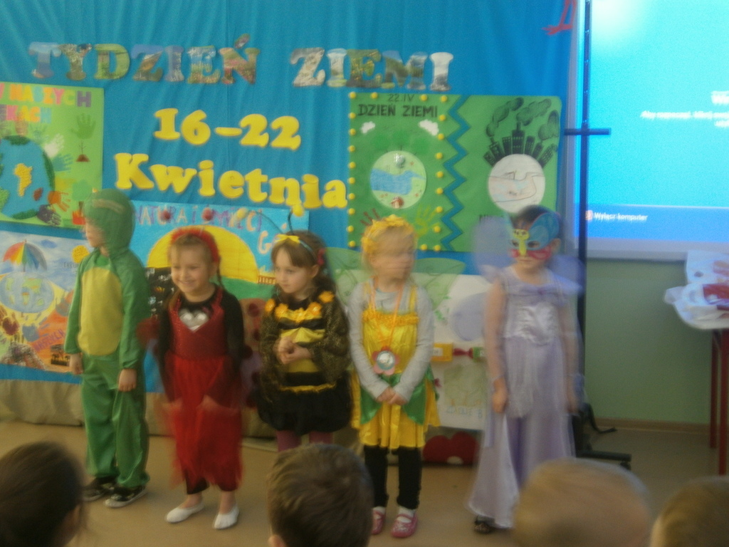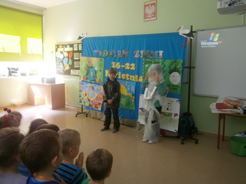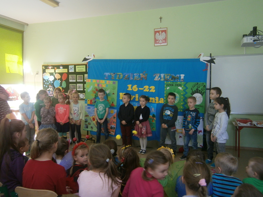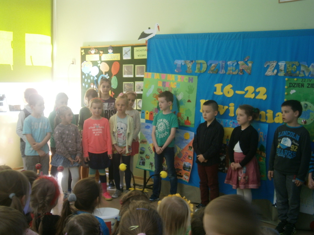 Dnia 22 kwietnia został przygotowany apel z okazji Święta Ziemi. W apelu udział wzięli uczniowie klasy I , którzy zaprezentowali przedstawienie – „Eko- posiedzenie”, w którym zachęcali wszystkich do dbania o środowisko naturalne. Przedstawienie uświetniły piosenki o tematyce ekologicznej zaśpiewane przez uczennice z klas I,II,III i pokaz mody ekologicznej w wykonaniu uczniów klasy II. Zaprezentowały się również dzieci z oddziału przedszkolnego, które w barwnych strojach zaśpiewały piosenkę o sprzątaniu w lesie.