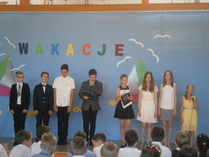 Mszą św. o godz. 8.00 odprawioną przez ks. proboszcza Tadeusza Wszołka rozpoczęło się zakończenie roku szkolnego. Po niej wszyscy uczestnicy przeszli do szkoły na dalszą część uroczystości. Dyrektor szkoły p. Bożena Świętek podziękowała uczniom i nauczycielom za naukę i pracę. W szczególny sposób zwróciła się do uczniów klasy szóstej opuszczających szkołę, których wyniki tegorocznego sprawdzianu uplasowały się na bardzo wysokich miejscach - I miejscu w gminie i V w powiecie. W dalszej części nastąpiło wręczenie nagród książkowych uczniom klas IV – VI, którzy osiągnęli średnią ocen co najmniej 4,75 oraz uczniom klas 0 - III wyróżniającym się pracowitością, pilnością i bardzo dobrymi wynikami w nauce. Uczniowie otrzymali również nagrody za wzorowe czytelnictwo oraz osiągnięcia sportowe. Uczennica klasy III - Zuzanna Piwek otrzymała wyróżnienie w Międzynarodowym Konkursie Kangur Matematyczny, zaś uczennica klasy IV, Wiktoria Wałaszek, za wzorową, stuprocentową frekwencję. Szczególnym wyróżnieniem – stypendium ufundowanym przez panią Izabellę Golec - córkę Justyna Juzy - jednego z patronów naszej szkoły, został uhonorowany uczeń klasy szóstej Adrian Skowroński, który osiągnął najwyższy wynik sprawdzianu. Pani Izabella podarowała także na ręce dyrektor książki do biblioteki szkolnej, za które serdecznie dziękujemy. Podziękowania za współpracę, a także listy gratulacyjne odebrali rodzice.