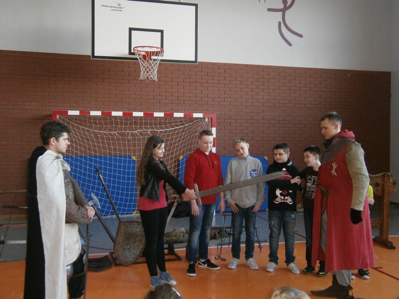 Dnia 26.01.2017 r. w naszej szkole odbyła się niecodzienna lekcja historii. Zaprezentowała ją Grupa Artystyczna ,,Rekonstrukto” z Lublina, która przybliżyła uczniom życie i kulturę epoki średniowiecza. Uczniowie mieli okazję zobaczyć, jak wyglądało rycerskie uzbrojenie i ekwipunek. Byli świadkami pasowania na rycerza oraz zakuwania w dyby. Dowiedzieli się o ówczesnym prawie i karach. Na własnej skórze mogli się przekonać, jak były one dotkliwe. Na koniec każdy uczestnik mógł osobiście zapoznać się z rekwizytami, przymierzyć hełm, potrzymać tarczę, buzdygan, „świński ryjek”. Pokaz spotkał się z dużym zainteresowaniem dzieci. Była to świetna nauka połączona z zabawą.