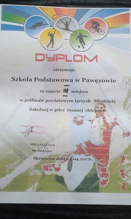 We wtorek nasi uczniowie występowali w półfinałach powiatowych w piłkę ręczną. Do zawodów zgłosiło się 4 szkoły Skrzyszów, Wojnicz, Wola Rzędzińska oraz Pawęzów. Nasi chłopcy w pierwszym meczu mimo iż długo prowadzili 2:0 przegrali z Wolą 3:2 (bramki zdobyli Arek Tryt i Przemek Biedroń), w drugim bardzo wyrównanym pojedynku zremisowali z Wojniczem 3:3 (bramki 2x Przemek Biedroń i 1 Arek Tryt) i w ostatnim przegrali ze Skrzyszowem. Skład drużyny: Jakub Jarmuła, Przemek Biedroń, Arek Tryt, Jakub Kożuch, Patryk Witek, Marcin Gdowski, Miłosz Mozgowiec oraz Karol Oleksy.