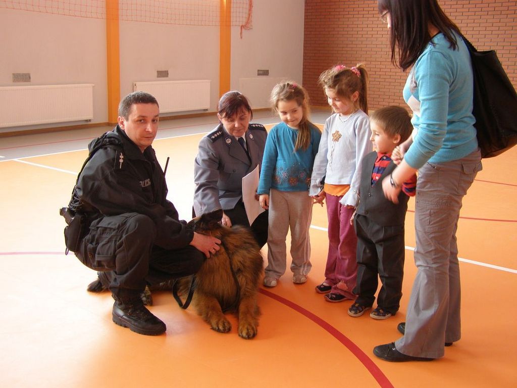 16 marca 2011 roku naszą szkołę odwiedzili policjanci. Przeprowadzili pogadankę z zakresu działań profilaktycznych na rzecz bezpieczeństwa dzieci w oddziałach 0-6 i działań prewencyjnych „Unikaj zagrożeń”. Zaprezentowali pracę i tresurę psa przewodnika oraz sposoby obrony przed atakującym zwierzęciem. Policjant pan Wacek i jego pies Roy wzbudzili szczery podziw oddaniem i posłuszeństwem zwierzęcia. Dowiedzieliśmy się o jedynym w Polsce miejscu tresury psów policyjnych Zakładzie Kynologii Policyjnej w Sułkowicach koło Warszawy. Okres takiej tresury to pół roku.