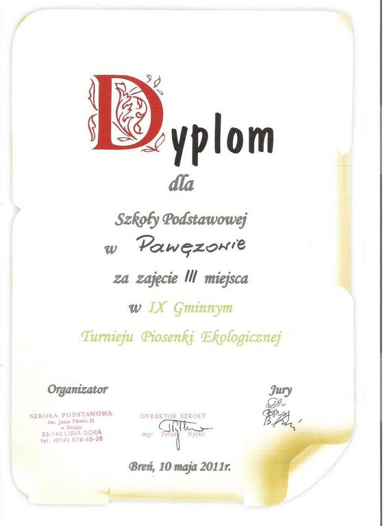 Już po raz IX odbył się Gminny Turniej Wiedzy Ekologicznej. Szkołę naszą reprezentowali uczniowie klasy 4 : Aleksandra Biedroń, Weronika Schab i Filip Juza. Uczestniczyli w różnych zadaniach przygotowanych przez organizatorów: pisali test wiedzy o znajomości gatunków drzew i krzewów polskich lasów i śpiewali piosenkę ekologiczną ( solistką była Weronika Schab ). Zadaniem dla całej szkoły była zbiórka plastikowych opakowań po napojach, których zebraliśmy 9 worków. Uczniowie poczuli smak rywalizacji uzyskując w ogólnym podsumowaniu wyróżnienie. Każdy otrzymał nagrodę rzeczową, a szkoła dyplom i atlas Krzewy Leśne. Gratulacje.