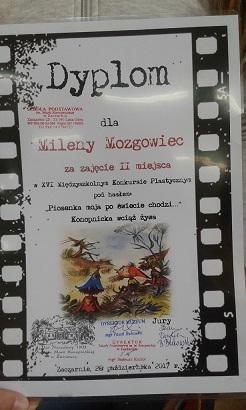 26 października 2017 roku uczennica klasy trzeciej Milena Mozgowiec zdobyła II miejsce w XVI Międzyszkolnym Konkursie Plastycznym pod hasłem „Piosenka moja po świecie chodzi …”. Konopnicka wciąż żywa. Milenka otrzymała dyplom i nagrody rzeczowe.