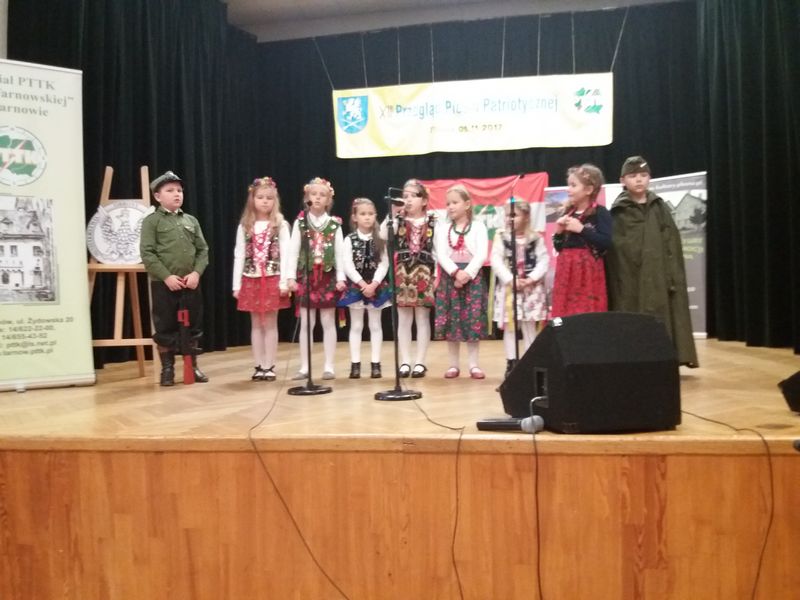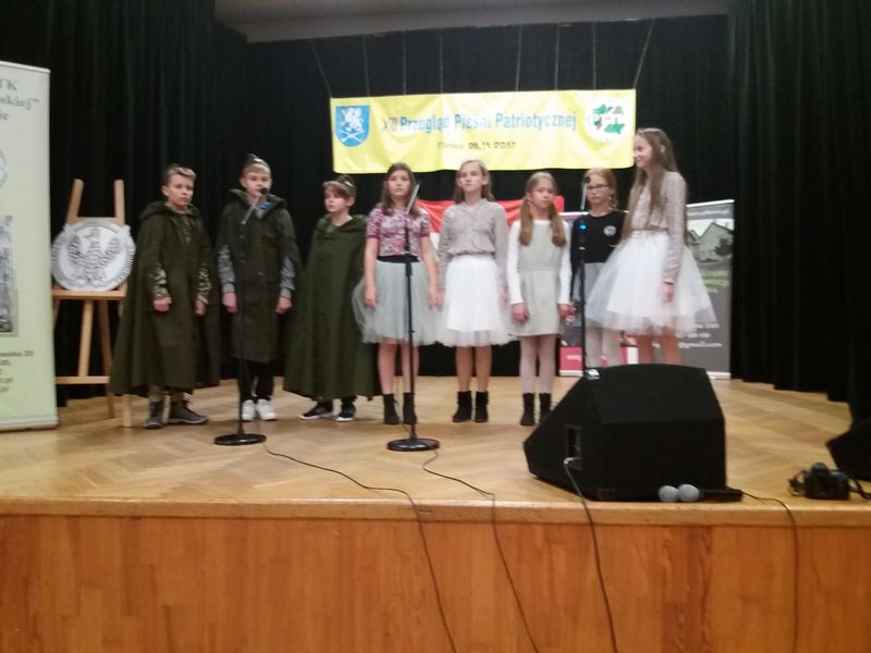 Dnia 9 listopada w Centrum Kultury w Pleśnej odbyła się trzynasta edycja Przeglądu Pieśni Patriotycznej. W tegorocznym przeglądzie udział wzięło aż 19 zespołów wokalnych i wokalno - instrumentalnych. Wykonawcy zaprezentowali po dwie pieśni z czasów wojennych, powstańczych lub powojennych. Byli oceniani w różnych kategoriach wiekowych, a brano pod uwagę przede wszystkim dobór repertuaru, interpretację, ogólne wrażenie oraz sposób wykonania utworu. Naszą szkołę w przeglądzie pod batutą P. Izabeli Ilcewicz reprezentowali uczniowie klas 2- 3: Nikola Marciniec, Amelia Górecka, Tamara Sowińska, Anna Stasiczak, Maksymilian Wójcik, Milena Mozgowiec, Blanka Blicharska, Martyna Głódź, Jakub Lis, którzy zaśpiewali utwory „Orlątko” oraz „Pieśń o wodzu miłym” i zajęli dla nas zaszczytne II miejsce. Natomiast uczniowie klas 4 – 7: Zofia Szerszeń, Zuzanna Piwek, Sylwia Grabczyńska, Magdalena Łabędź, Karol Oleksy, Patryk Witek, Jakub Jarmuła, Aleksandra Stono zajęli również wysokie III miejsce prezentując utwory „Przybyli ułani pod okienko” i „Jak szło wojsko raz ulicą”.