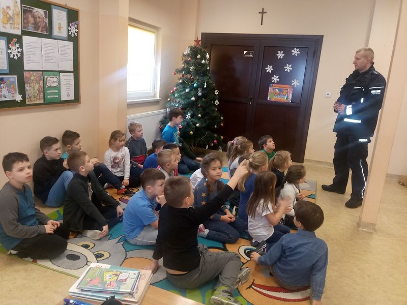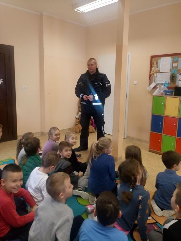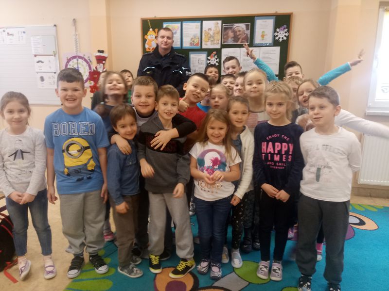 Dnia 24 stycznia 2018 r. w ramach akcji "Bezpieczne ferie" z uczniami klas I - IV spotkał się pan policjant Daniel Barnaś - dzielnicowy. Funkcjonariusz w trakcie spotkania apelował do najmłodszych o grzeczne i bezpieczne zachowywanie się w czasie zabawy z innymi dziećmi podczas zbliżających się ferii zimowych. Przypomniał uczniom o ich odpowiedzialności za siebie i swoich kolegów. Przestrzegał przed niebezpieczeństwami, jakie mogą ich spotkać w czasie zabaw na śniegu i lodzie. Poinformował między innymi, jak bardzo niebezpieczne jest zjeżdżanie na sankach w okolicach, gdzie odbywa się ruch pojazdów. Zachęcał do korzystania wyłącznie ze specjalnie przygotowanych lodowisk. Pod żadnym pozorem nie należy wchodzić na lód zamarzniętych zbiorników wodnych, jezior, stawów, itp. Prosił, aby nie rzucać w kolegów śnieżkami z ubitego śniegu, z kamykami i kawałkami lodu w środku, gdyż może doprowadzić to do obrażeń ciała. Nie należy ślizgać się na chodnikach i przejściach dla pieszych, gdyż wyślizgana nawierzchnia stanowi ryzyko złamania kończyn. Przypomniał również obowiązujące przepisy ruchu drogowego, akcentując jak ważne jest ich przestrzeganie.
