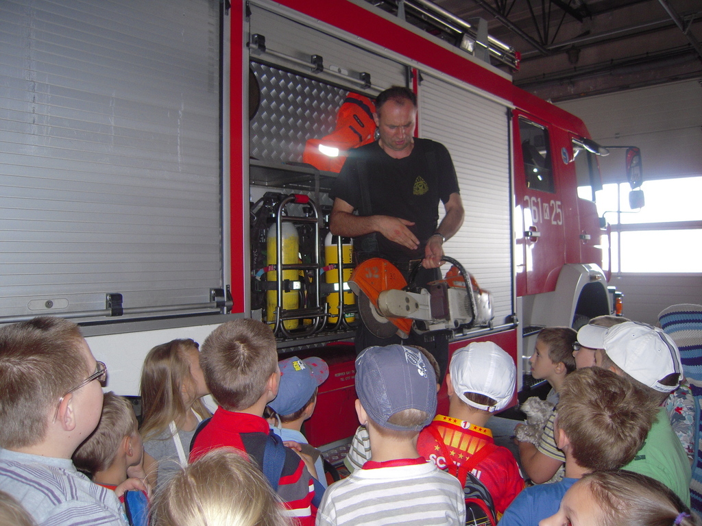 Uczniowie oddziałów 0-III uczestniczyli w wycieczce do Straży Pożarnej w Tarnowie przy ul.Klikowskiej. Oglądnęli profesjonalny sprzęt pożarniczy, wozy strażackie, przymierzali też strój strażaka. W trakcie pobytu widzieli strażaków podczas autentycznej akcji ratunkowej. Uczniowie oglądnęli prezentację profilaktyczną. Ewakuowali się z pomieszczenia wypełniającego się dymem. Na końcu szkolenia nastąpiła ewaluacja ( sprawdzenie ) ich wiedzy na temat zagrożeń związanych z ogniem, gazem, wypadkami na drodze, katastrofami budowlanymi, powodzią.