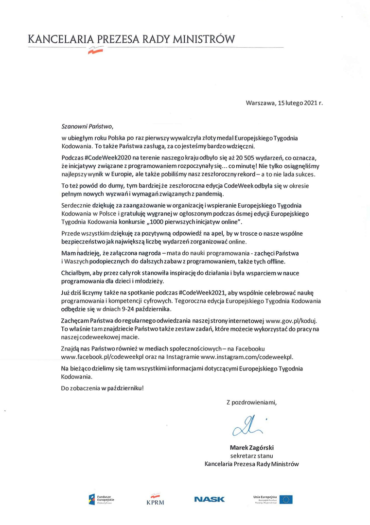 Miło nam poinformować, że szkoła została laureatem konkursu "1000 pierwszych inicjatyw online". Dzięki temu otrzymała nagrodę: matę do nauki programowania.