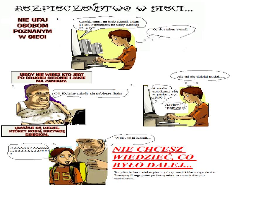 Uczniowie klasy 5 na zajęciach z informatyki przygotowali prezentacje dla młodszych kolegów dotyczącą bezpieczeństwa w "sieci". Zwrócili uwagę na niebezpieczeństwo zawierania znajomości i utrzymywania kontaktów na forach internetowych z osobami nieznajomymi. Zbliżające się wakacje to czas, który należy aktywnie i czynnie wykorzystać na wolnym powietrzu, nie spędzać go przy komputerze. Pamiętajmy o tym:)
