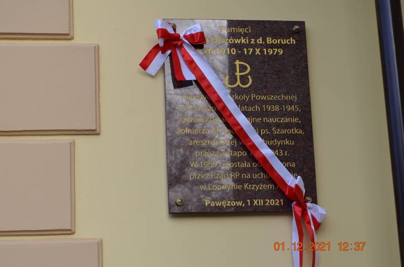 1 grudnia 2021 roku odbyła się uroczystość odsłonięcia tablicy pamiątkowej poświęconej Wiktorii Boruch – Olszówce - nauczycielce języka polskiego, łączniczce Armii Krajowej o pseudonimie „Szarotka”. Pomysłodawcami i fundatorami tablicy była rodzina pani Wiktorii. Uroczystość zaszczycili swoją obecnością: p.o. dyrektora Delegatury Tarnów Kuratorium Oświaty p. Łukasz Drewienkiewicz oraz wizytator – pani Bożena Nowak; synowie Wiktorii Olszówki – p. Stanisław, Adam, Wojciech i Tadeusz wraz z rodzinami; przewodniczący Rady Gminy – p. Ryszard Witek, sołtys wsi – pani Małgorzata Niedojadło, emerytowana dyrektor – p. Teresa Rydzy oraz przedstawiciele organizacji działających na terenie sołectwa Pawęzów. Uroczystość rozpoczęto mszą świętą sprawowaną przez proboszcza Tadeusza Wszołka. Następnie wszyscy zgromadzeni, w asyście pocztu sztandarowego, udali się przed budynek starej szkoły. Po odśpiewaniu hymnu szkoły, w imieniu rodziny, z okolicznościowym przemówieniem wystąpiła pani Magdalena Jóźwiak. Po uroczystym odsłonięciu i poświęceniu tablicy wszyscy zebrani przeszli do sali gimnastycznej na dalszą część uroczystości. Dyrektor szkoły, Bożena Świętek, w przemówieniu do zgromadzonej publiczności zwróciła uwagę na fundamentalną rolę autorytetów w procesie wychowywania dzieci i młodzieży, zaś uczniowie zaprezentowali okolicznościowy montaż słowno-muzyczno-taneczny ukazujący sylwetkę Wiktorii Boruch – Olszówki. Zwrócili uwagę na jej oddaną, pełną poświęceń pracę pedagogiczną, także tę konspiracyjną. Pani Wiktoria Boruch – Olszówka – oddana i gorliwa nauczycielka szkoły w Pawęzowie, dla której umiłowanie języka polskiego, szacunek dla wszystkiego, co polskie było nadrzędnym elementem edukacji dzieci zajęła zaszczytne miejsce obok żołnierzy Batalionu Barbara Armii Krajowej – patronów szkoły.
