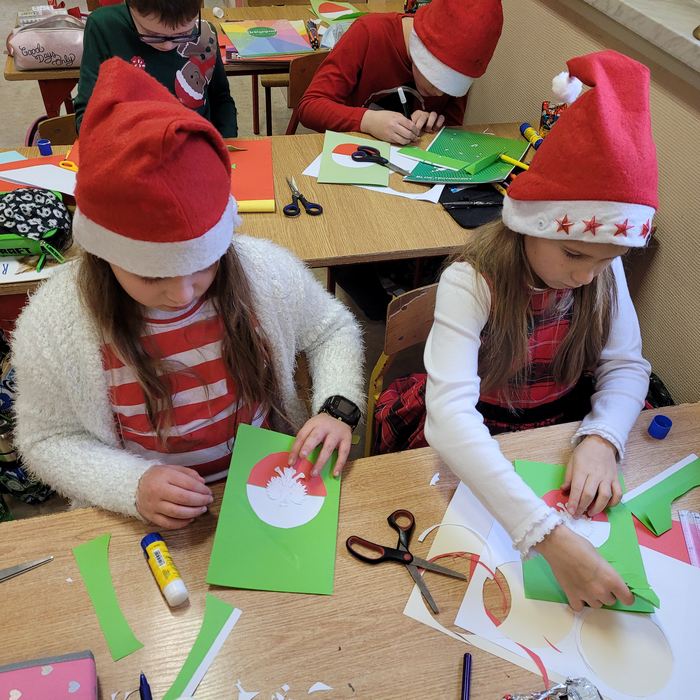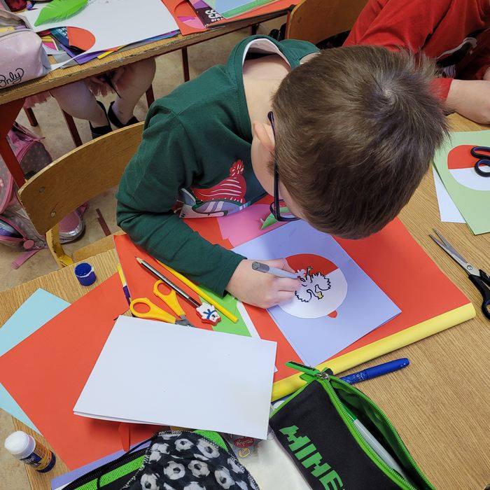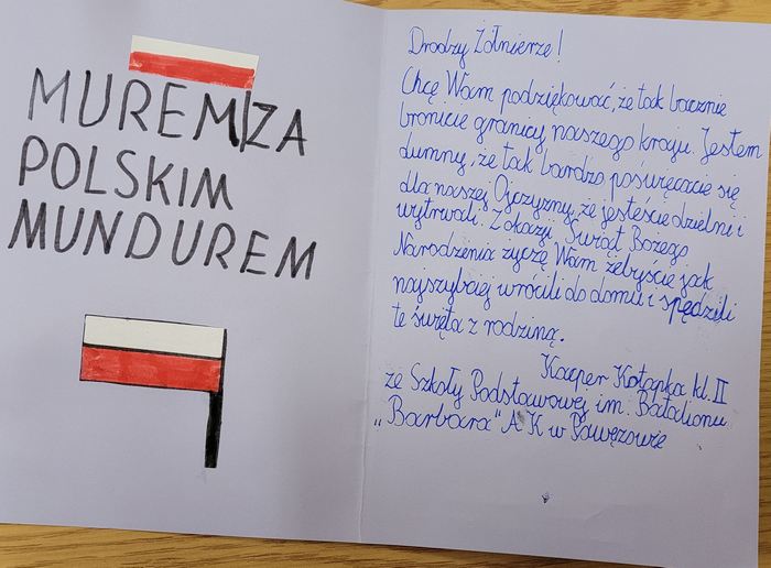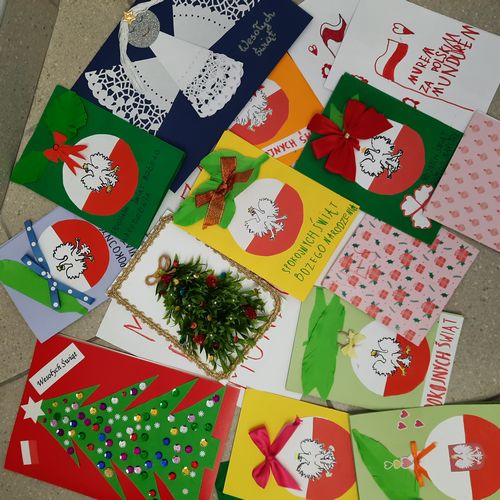 Dnia 8 grudnia 2021r. uczniowie naszej szkoły w odpowiedzieli na list i prośbę Fundacji Patriotycznej im. Witolda Pileckiego w Szczecinie, wykonali własnoręcznie kartki bożonarodzeniowe z motywami patriotycznymi. Dzieci włączając się do akcji „Kartka dla obrońców Ojczyzny” wsparły mundurowych, by sprawić im przyjemność i podnieść na duchu w tak trudnym czasie. Włożyły wiele wysiłku i czasu, aby przygotować kartki okolicznościowe ze świątecznymi życzeniami skierowane do żołnierzy. Kartki zostały odebrane przez koordynatora - stowarzyszenie Tarnów Pierwsze Niepodległe i przekazane do jednostki pełniącej służbę na wschodniej granicy Polski.