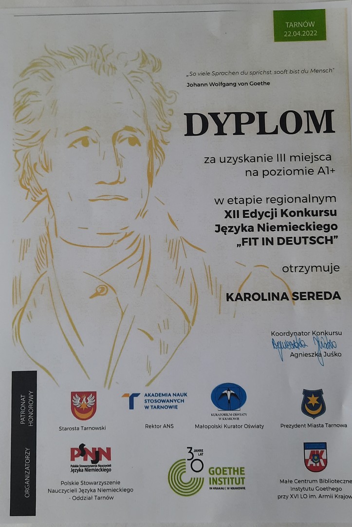 Uczennica klasy ósmej Karolina Sereda zdobyła III miejsce w XII Edycji Konkursu Języka Niemieckiego Fit in Deutschdla szkół podstawowych i ponadpodstawowych w kategorii dla szkół podstawowych poziom A1+.