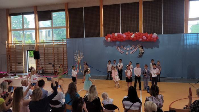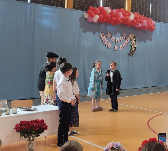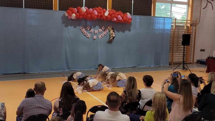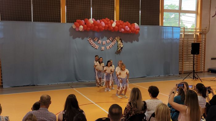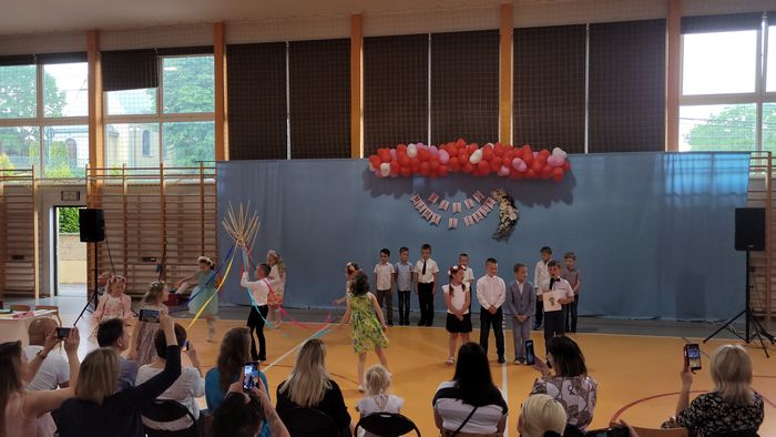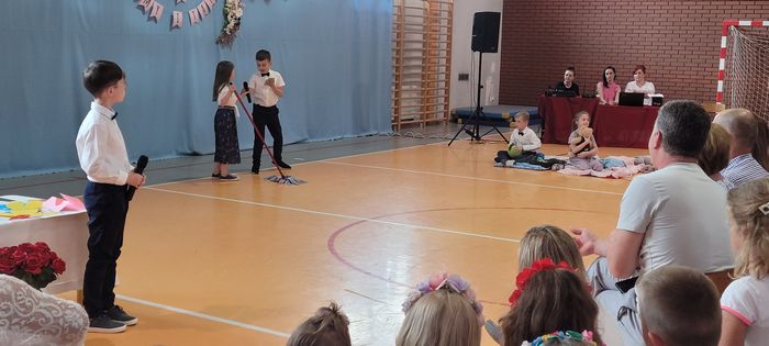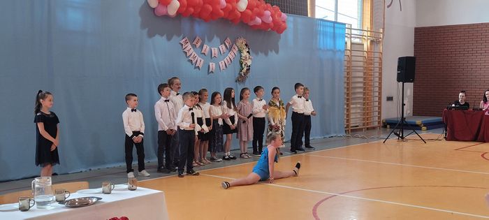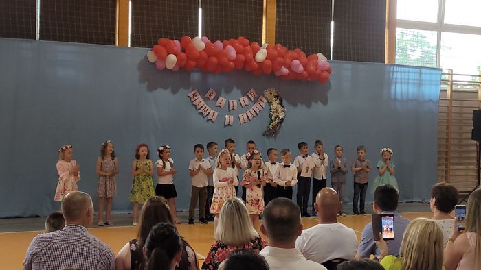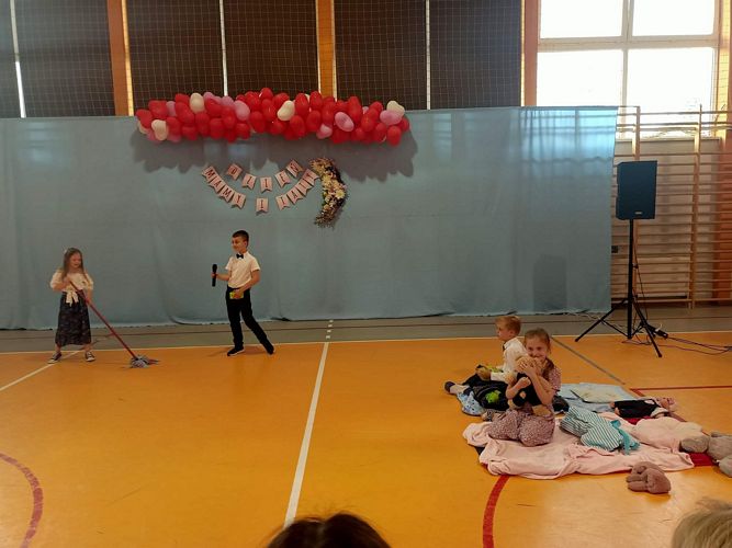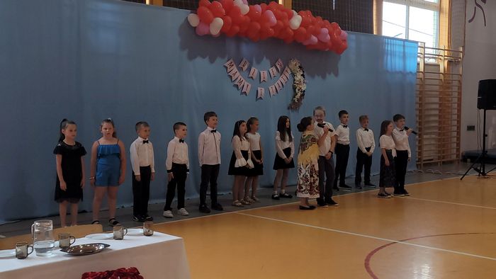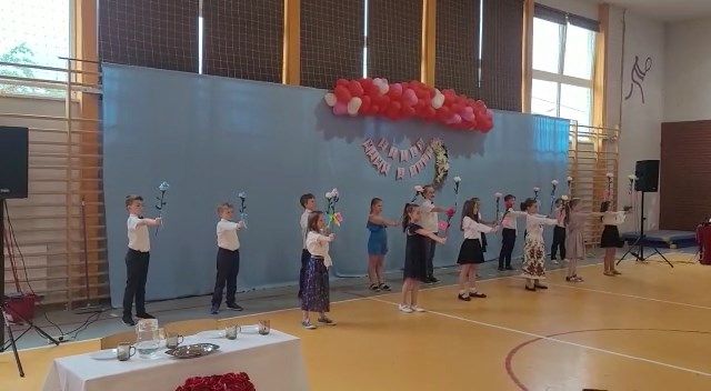 Wszyscy uczniowie i Goście licznie zebrali się na sali gimnastycznej przed godziną 16.00. To spotkanie było bardzo doniosłe za sprawą Rodziców i dzieci, którzy pojawili się w komplecie. W akademii wzięli udział uczniowie młodszych klas, którzy wykonali: taniec „Karuzela dla Mamy i Taty” z zielonym gaikiem /kl. I/, pląs w żywym tempie „Tańczące kwiaty”/kl. II/ i subtelny taniec ze wstążkami do utworu ”River Flows in You” /dziewczynki z kl. III/. Dzieci z klasy II przygotowały przedstawienie pt. „Laurka”, które miało na celu kształcenie szacunku do członków rodziny, wzajemnej współpracy, rozbudzenie wrażliwości na pomoc innym i wzmacnianie rodzinnych więzi. Była to szczególna okazja, by okazać Rodzicom wdzięczność. Uczniowie recytując wiersze, śpiewając piosenki, a także składając przybyłym Gościom najserdeczniejsze życzenia wyrazili w ten sposób wzruszające podziękowania za ich trud wychowania, miłość, wsparcie i poświęcenie.
