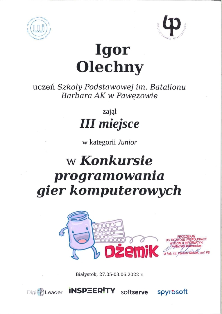 Miło nam poinformować, że Igor Olechny uzyskał III miejsce w Konkursie Pisania Gier Komputerowych Wydziału Informatyki Politechniki Białostockiej DŻEMIK 2022 o zasięgu ogólnopolskim.