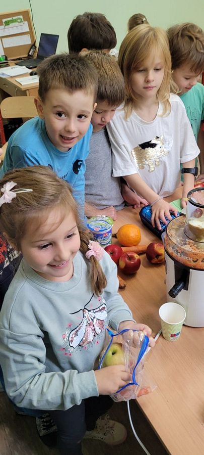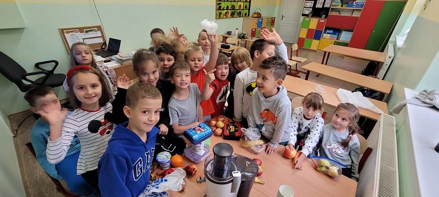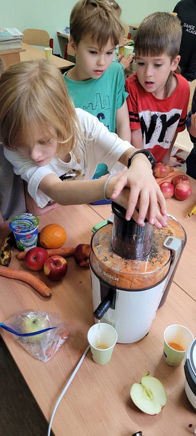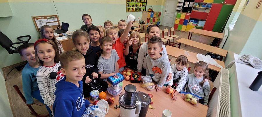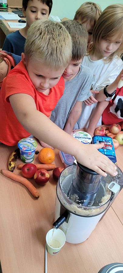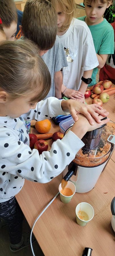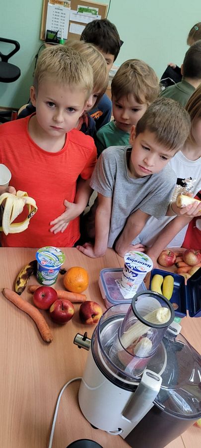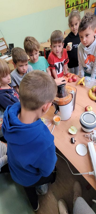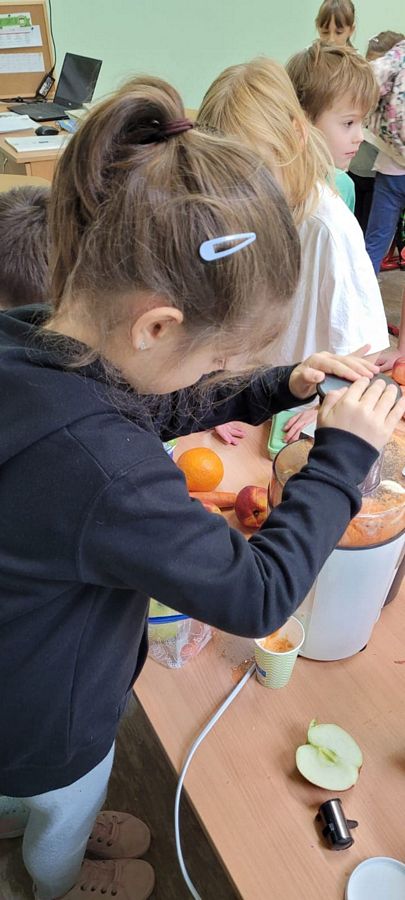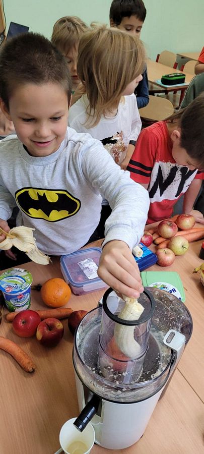 Dzieci z wielkim zainteresowaniem za pomocą sokowirówki i blendera przygotowały smaczne i zdrowe soki oraz koktajle. Dzięki zakupionemu sprzętowi uczniowie uczyli się radzenia sobie w życiu codziennym oraz dbania o porządek na stanowisku pracy. Zwieńczeniem zajęć była pełna różnorodnych smaków degustacja.