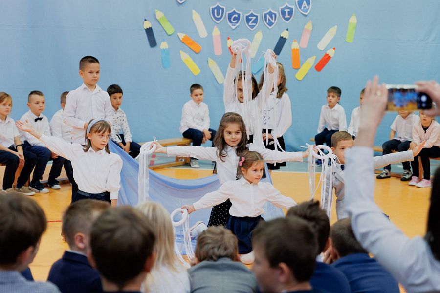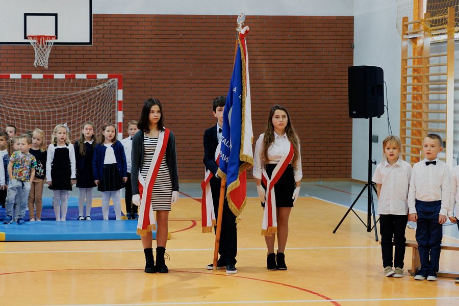 Dzieci zaprezentowały przygotowany program artystyczny, a następnie złożyły przysięgę na Sztandar Szkoły. Aktu pasowania symbolicznym ołówkiem dokonała Pani Dyrektor Bożena Świętek.