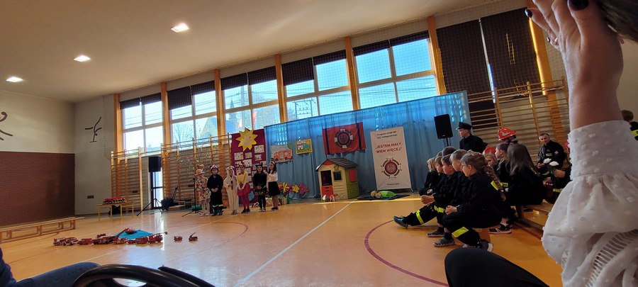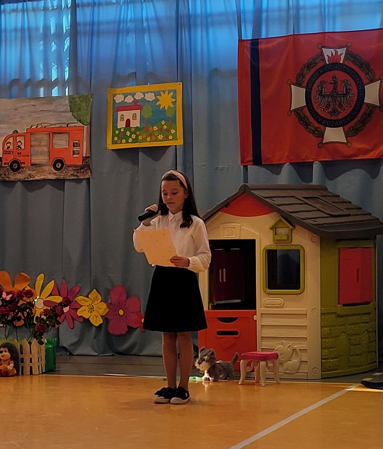 Podczas akademii wszyscy uczniowie kl. III wzięli udział w przedstawieniu pt.” O Maciusiu, który marzył, by w pożarnej służyć straży”. Wesoła drużyna w składzie: kot, kogut i pies, na czele z małym Maćkiem uczyła dzieci, jak obchodzić się z ogniem i wodą podczas zagrożenia. Maja i Oliwia /kl. IV/ubrane w góralskie stroje, zaśpiewały piosenkę o dzielnym strażaku, natomiast chłopcy: Igor /kl. VII/ i Bartek /kl. IV/ dżentelmeńskim gestem podziękowali dziewczętom za piękny śpiew.
