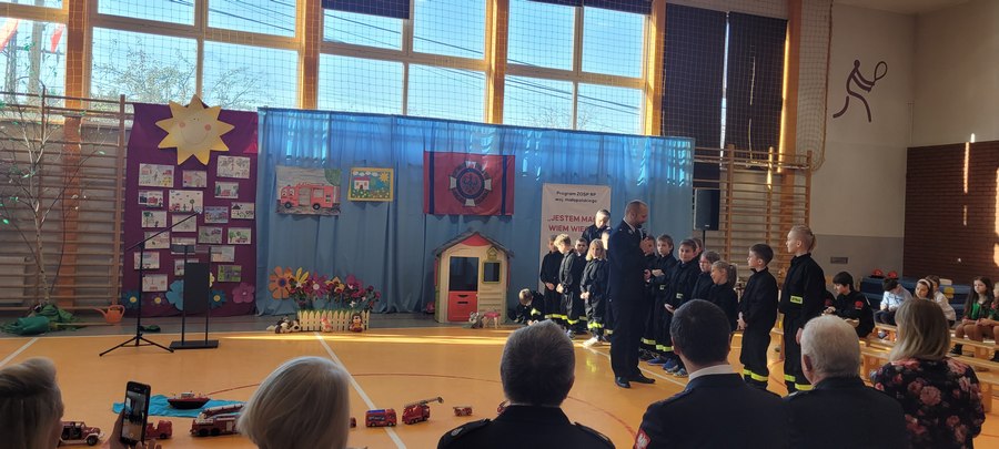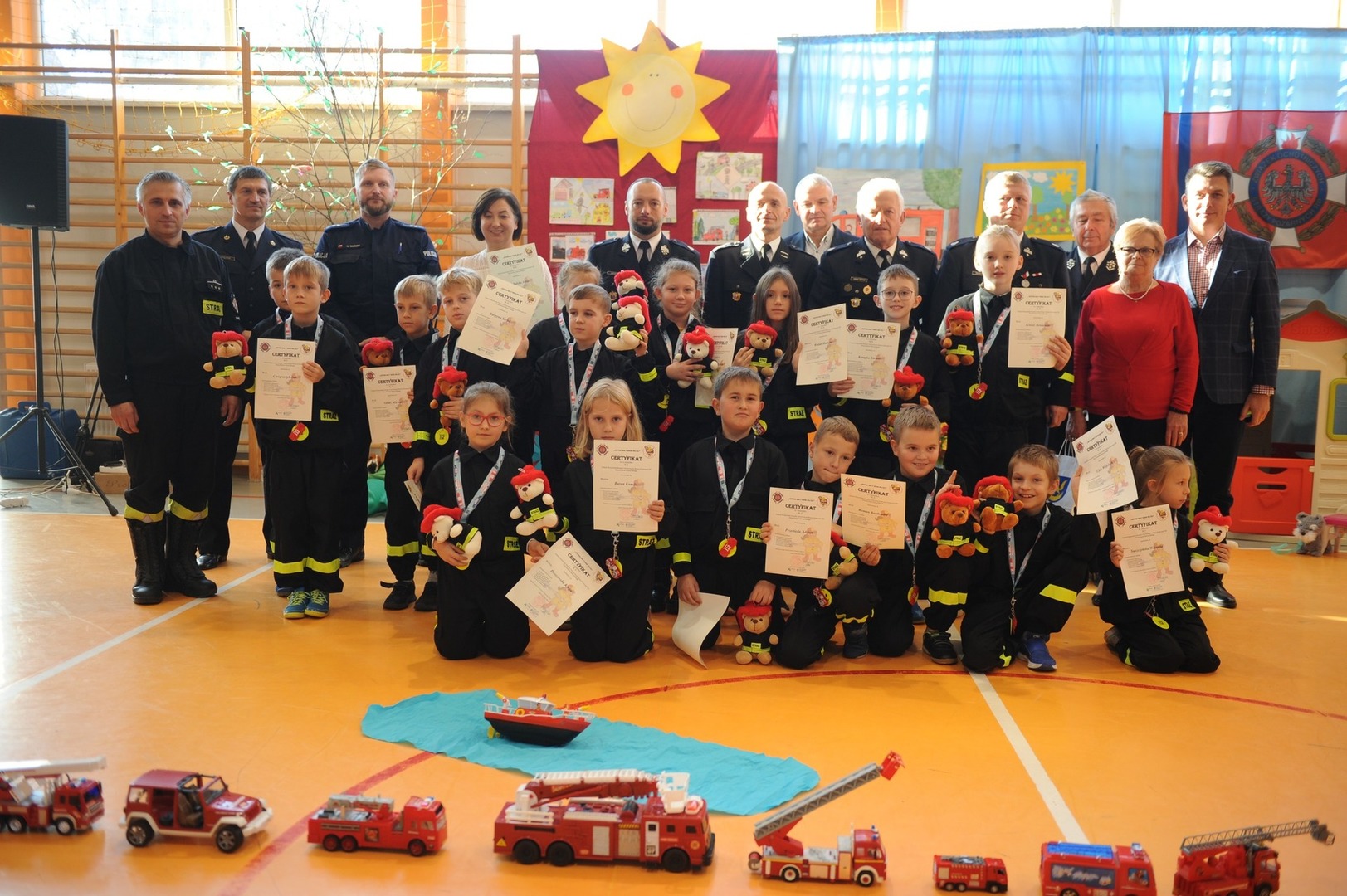 Po części artystycznej młodzi adepci pożarnictwa przedstawili swoje umiejętności. Został przeprowadzony egzamin ustny i praktyczny z nabytej przez nich wiedzy, który przeprowadził druh Łukasz Łach – Dyrektor Zarządu Wykonawczego Zarządu Oddziału Wojewódzkiego ZOSP RP woj. małopolskiego. Uczniowie celująco zdali egzamin, bezbłędnie odpowiadając na zadawane pytania. Na zakończenie każdy z uczestników otrzymał certyfikat potwierdzający udział w projekcie oraz maskotkę- strażaka. Pani Sołtys - Małgorzata Niedojadło przygotowała dla dzieci słodkości, a Z-ca Dyrektora MORD w Tarnowie- Sławomir Turek wręczył odblaskowe opaski.