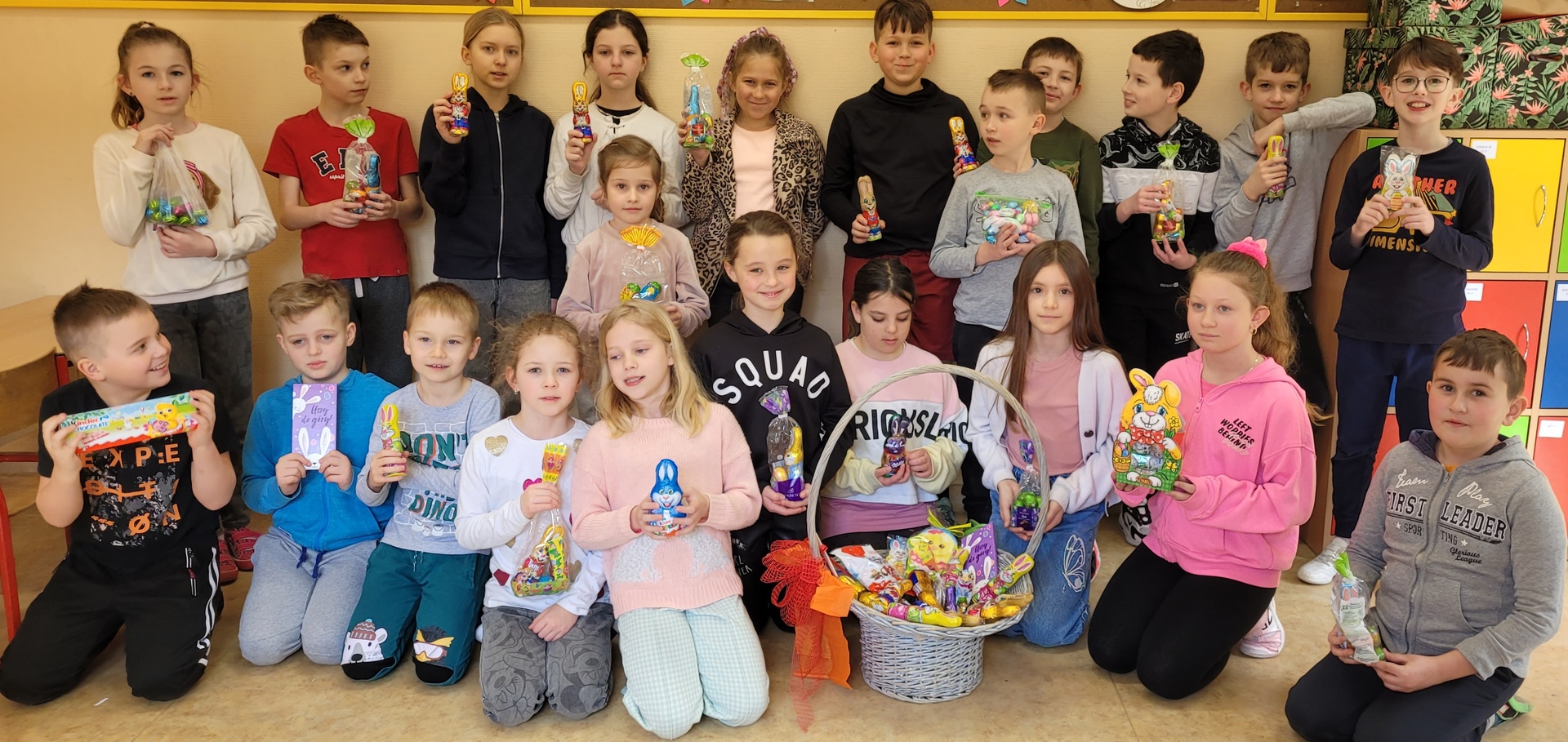 Dnia 31 marca 2023r. w naszej szkole zakończyła się akcja pod hasłem: "Wielkanocny zajączek dla Ukrainy”. Dzieci przyniosły do wielkanocnego kosza czekoladowe słodkości: zajączki, baranki, jajeczka, pierniki oraz czekolady. Nie po raz pierwszy uczniowie otworzyli swoje serca na potrzeby innych. Zawsze chętnie biorą udział w różnych akcjach charytatywnych organizowanych w szkole. Jedna z uczennic- Luna wykonała kartkę świąteczną i napisała życzenia: „Szybkiego zakończenia wojny!”