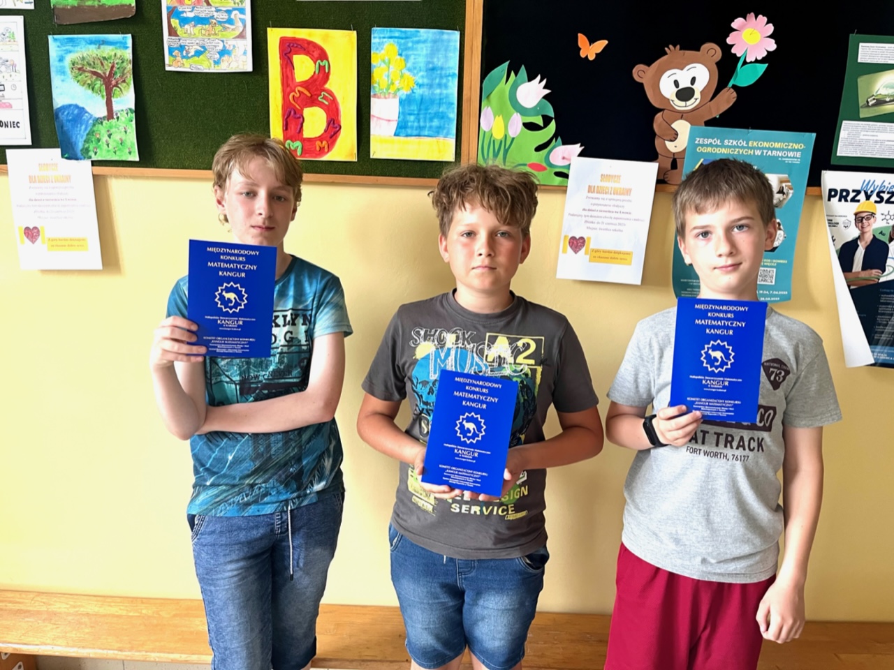 16 marca 2023r. odbyła się w naszej szkole XXXII edycja Międzynarodowego Konkursu „Kangur Matematyczny”. W tegorocznym Kangurze uczestniczyło 18 uczniów naszej szkoły, w tym 6 uczniów klas II-III oraz 12 uczniów klas IV-VIII. Wyróżnienie w konkursie uzyskało dwóch uczniów - Jan Chrzęszczyk oraz Beniamin Kiwior. Dyplomy oraz nagrody książkowe zostały wręczone Jankowi oraz Beniaminowi podczas uroczystego zakończenia roku szkolnego. Pozostali uczestnicy otrzymali dyplomy w ostatnim tygodniu nauki. Gratulujemy wyników, życzymy dalszych sukcesów i zachęcamy do udziału w konkursie w kolejnym roku szkolnym!
