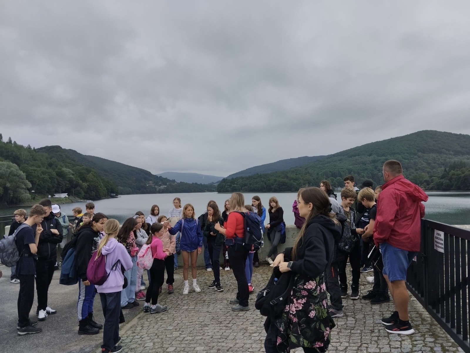 W dniach 13-14 czerwca 2024 r. uczniowie klas 4-8 brali udział w dwudniowej wycieczce wokół Bieszczadzkich Jezior. W czwartek wyruszyliśmy autokarem z Pawęzowa w kierunku Myczkowiec. Pierwszym punktem wycieczki było wyjście na Górę Sobień, gdzie zwiedziliśmy ruiny zamku, którego historia sięga XIII wieku. Stamtąd przejechaliśmy do pomnika przyrody - Kamienia Leskiego, o którym w swoich pamiętnikach pisał m.in. Aleksander Fredro. Następnie udaliśmy się do Zwierzynia, gdzie przespacerowaliśmy się do Cudownego Źródełka, a później przez Grodzisko na Zaporę w Myczkowcach. Tam mogliśmy posłuchać, jak działa elektrownia wodna i jak była budowana. Przez Rezerwat Przyrody „Koziniec” dostaliśmy się do punktu widokowego na Kozińcu, a nasza wycieczka zakończyła się u stóp kamieniołomu w Bóbrce. Po wyczerpującej, ale pełnej wrażeń wędrówce, odbyliśmy podróż do miejsca zakwaterowania w Polańczyku. Po pysznej obiadokolacji uczniowie integrowali się spędzając wspólnie czas i korzystając z atrakcji hotelu.