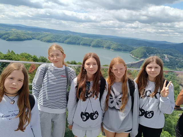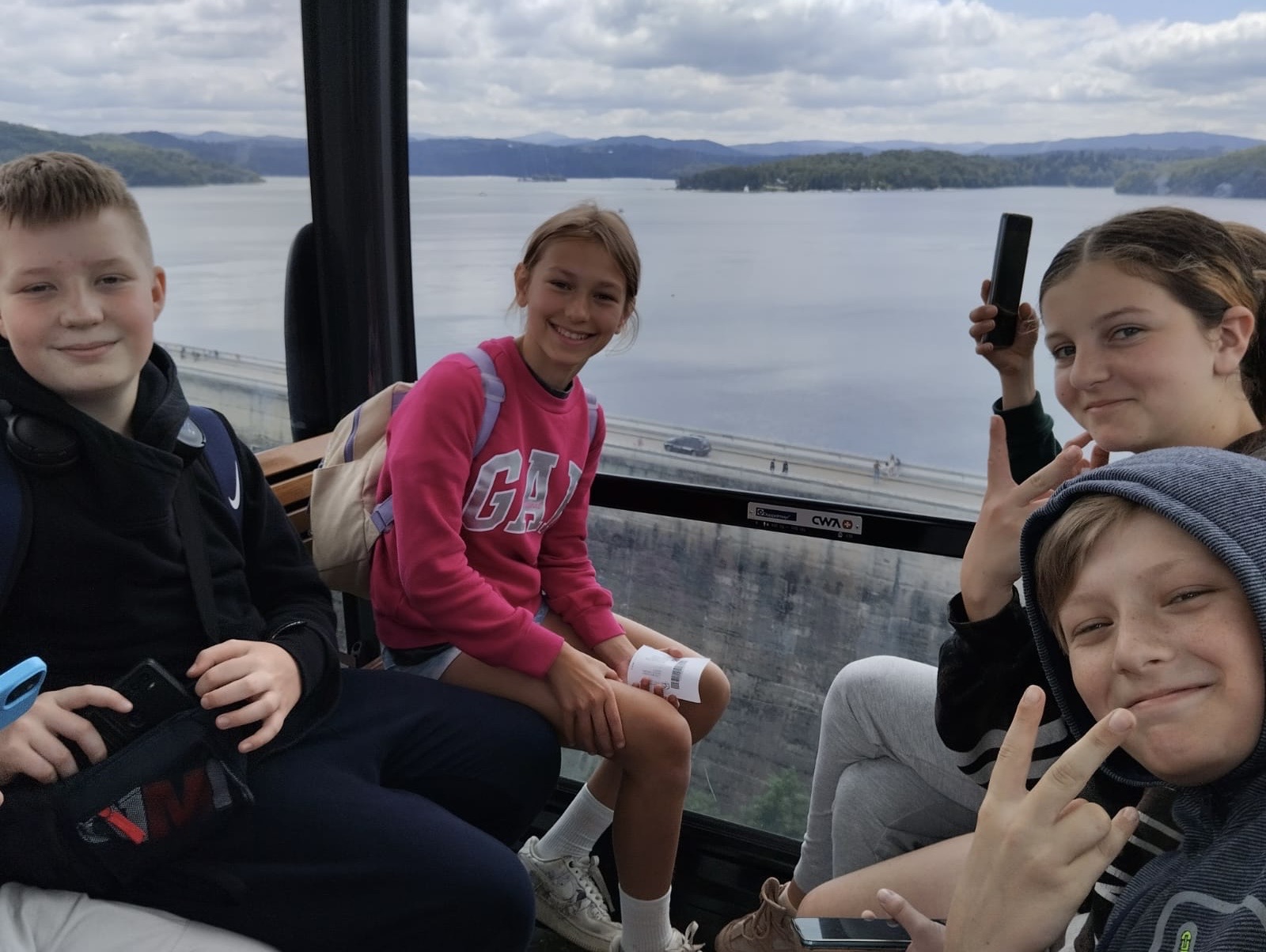 Drugiego dnia, po śniadaniu, wyruszyliśmy na rejs widokowy po Jeziorze Solińskim statkiem TRAMP, w czasie którego mogliśmy posłuchać o historii i ciekawostkach związanych z Soliną oraz podziwiać Wyspę Zajęczą, Zaporę w Solinie, WZW Jawor, Martwy Las i Wyspę Skalistą. Kolejnym punktem wycieczki był przejazd najnowszą i najwyższą koleją linową w Polsce oraz jedną z najwyższych w Europie ze stacji Plasza. Przy okazji dowiedzieliśmy się wielu ciekawych informacji na temat podróży koleją, jej technologii, a także o historii najwyższej w Polsce zapory wodnej - Zapory w Solinie, która jest działającą elektrownią wodną. Punktem docelowym gondoli była stacja górna Jawor, gdzie po opuszczeniu peronu udaliśmy się na wieżę widokową. Na samym jej szczycie podziwialiśmy piękne widoki z otwartego tarasu widokowego i zewnętrznego skywalku. Po zjeździe gondolą przespacerowaliśmy się na Zaporę w Solinie oraz deptak, przy którym uczniowie nabyli przeróżne pamiątki. Po zakończeniu zwiedzania i pożegnaniu z Panią przewodnik wyruszyliśmy w podróż powrotną do Pawęzowa.