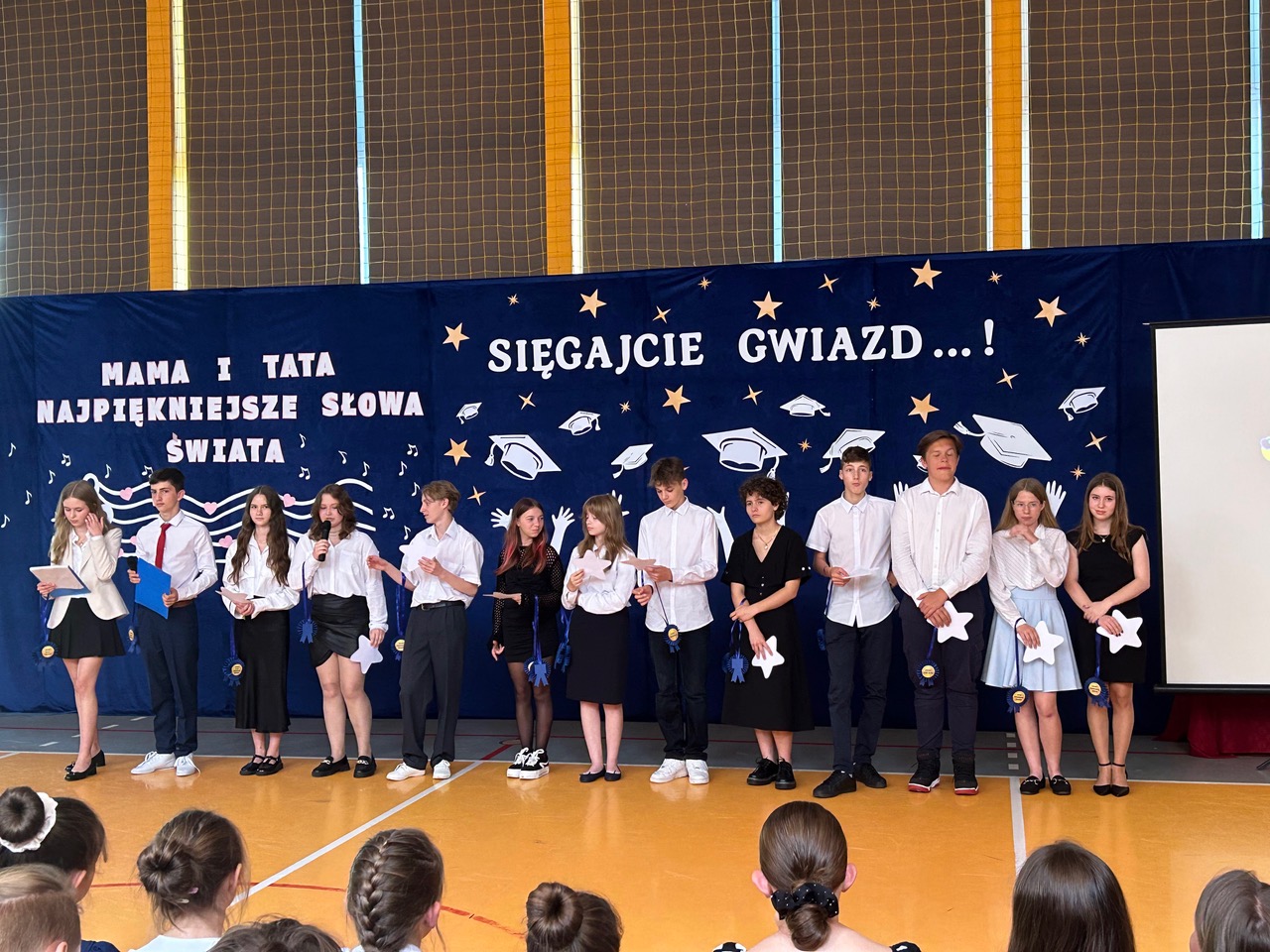 Zakończenie roku szkolnego 2023/2024 rozpoczęło się od Mszy Świętej o godz. 10:00 odprawionej przez ks. proboszcza Tadeusza Wszołka. Następnie wszyscy zgromadzeni przeszli do szkoły. Uroczystą akademię rozpoczęły Anna Stasiczak oraz Eliza Witkiewicz pięknym wykonaniem piosenki „Nie bój się chcieć”. Po wprowadzeniu sztandaru i odśpiewaniu hymnu państwowego oraz hymnu szkoły głos zabrała Pani Dyrektor Bożena Świętek, która podziękowała uczniom i nauczycielom za dziesięć miesięcy wytężonej pracy. W szczególny sposób zwróciła się do uczniów klasy ósmej opuszczających szkołę. W dalszej części nastąpiło wręczenie nagród książkowych uczniom klas IV – VIII, którzy osiągnęli średnią ocen co najmniej 4,75. Uczniowie otrzymali również nagrody i dyplomy