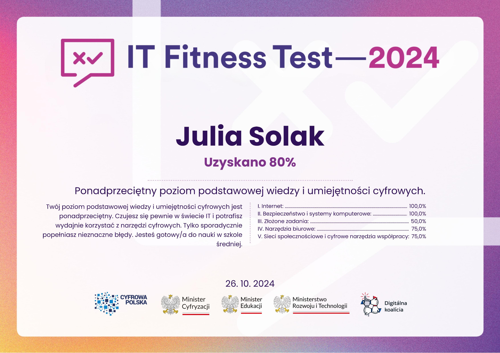 Miło nam poinformować, że Julia Solak, uczennica klasy VIII uzyskała 80% w teście umiejętności informatycznych "IT Fitness Test 2024" wykazując ponadprzeciętny poziom podstawowej wiedzy i umiejętności cyfrowych.