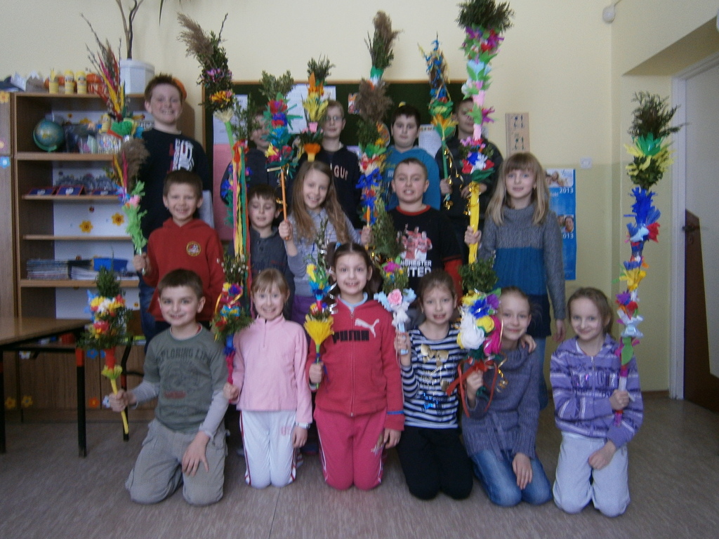 Pani Mariola Lipińska i pani Jolanta Polczyk wraz ze swoimi uczniami wykonują palmy na najbliższą Niedzielę Palmową.