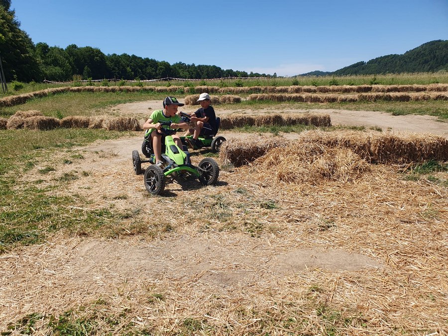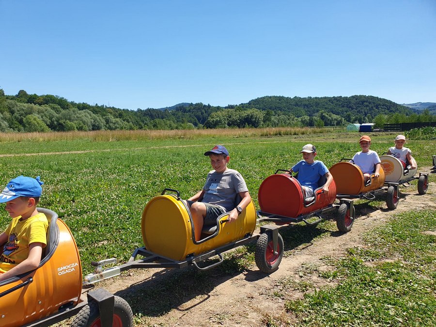 Nie zabrakło także zabaw na świeżym powietrzu. Dzieci z radością korzystały z przygotowanych atrakcji: jeździły na gokartach z pedałami, strzelały z łuku, brały udział w zabawach ruchowych w lesie, a także miały okazję przejechać się lokomotywą napędzaną przez ciągnik rolniczy, co dostarczyło wszystkim mnóstwo śmiechu i radości.