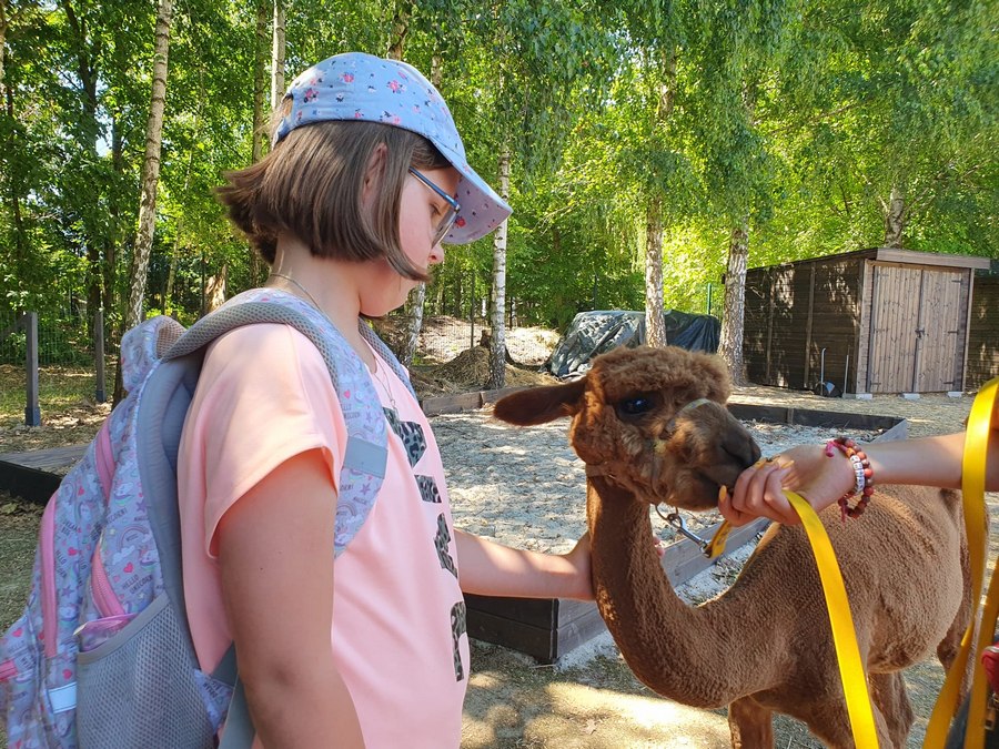 Na zakończenie dnia dzieci odwiedziły jeszcze jedno niezwykłe miejsce – Wioskę Alpak, gdzie poznały cztery urocze alpaki: Granda, Eddiego, Domisia i Smyka – jedyne alpaki mieszkające w Krakowie! Spotkanie z tymi sympatycznymi zwierzętami wzbudziło wiele radości i uśmiechu, a dzieci z entuzjazmem zadawały pytania i głaskały miękkie futerko nowych przyjaciół.