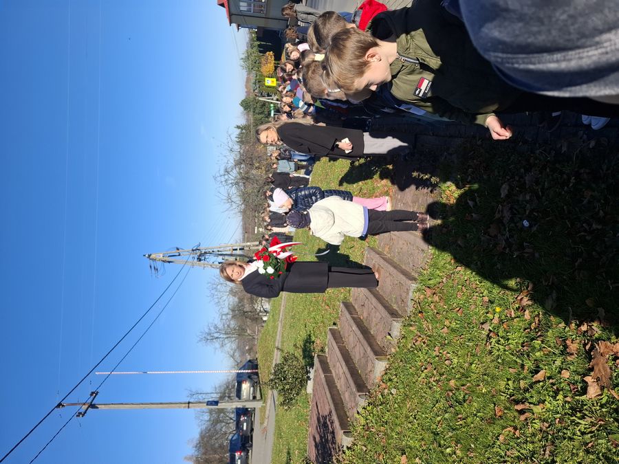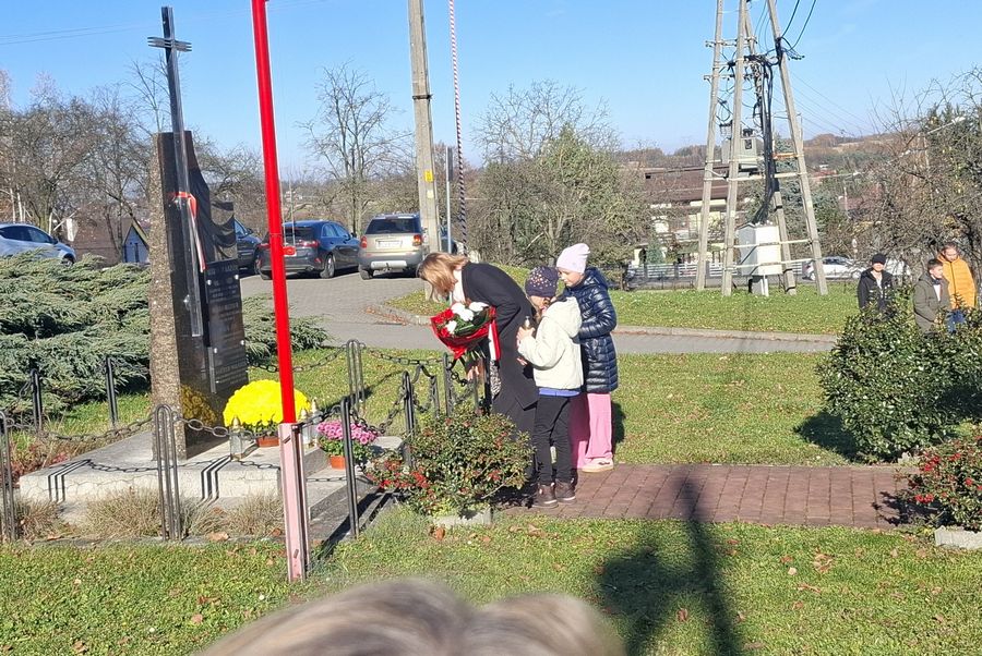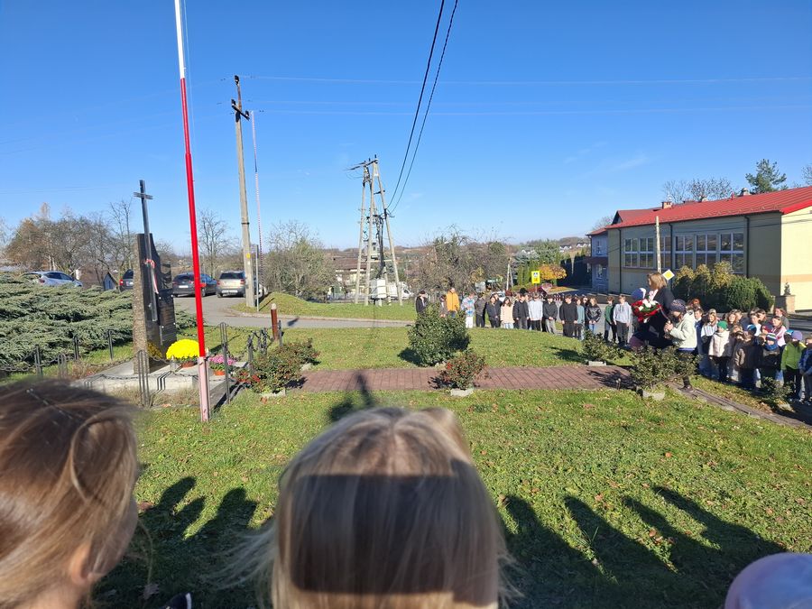 Dnia 7 listopada 2025 r. społeczność szkolna udała się pod pomnik ofiar II wojny światowej, aby oddać hołd poległym. Pani dyrektor Bożena Świętek, w asyście młodszych uczniów, złożyła kwiaty w barwach narodowych i zapaliła znicze, wyrażając pamięć i szacunek dla tych, którzy zginęli w czasie wojny.