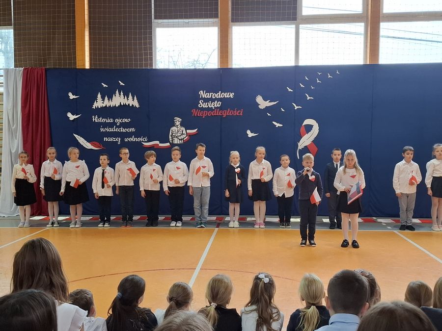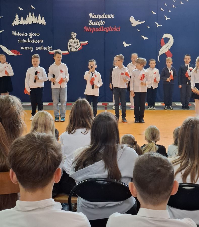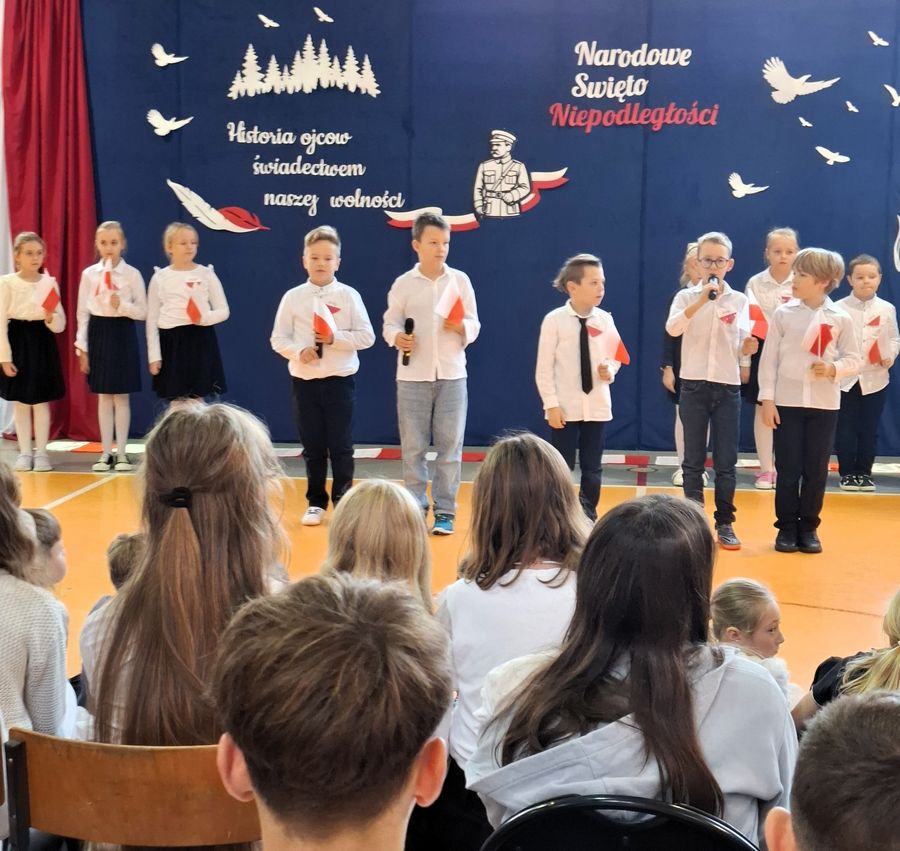 12 listopada 2025 r. w naszej szkole odbyła się uroczysta akademia upamiętniająca 107. rocznicę odzyskania przez Polskę niepodległości. Uroczystość zgromadziła całą społeczność szkolną, tworząc podniosłą i patriotyczną atmosferę. Program artystyczny przygotowali uczniowie klasy III, którzy z dużym zaangażowaniem zaprezentowali wiersze oraz piosenki o tematyce patriotycznej. Występujący wykonali także taniec z biało-czerwonymi flagami do melodii „Polskie drogi”, który wzbudził zaciekawienie wśród publiczności. Akademię poprowadziła Oliwia, która kierowała uwagę uczniów na najważniejsze wartości związane z tym świętem. Zadawała pytania dotyczące takich pojęć jak: niepodległość, ojczyzna, patriotyzm oraz symbole narodowe, zachęcając uczniów do wspólnej refleksji i aktywnego udziału. Uroczystość uświetnił także występ szkolnego chóru, który zaprezentował pieśni patriotyczne, nadając wydarzeniu wyjątkowy charakter. W ramach akcji „Szkoła do Hymnu” cała społeczność naszej szkoły wzięła udział we wspólnym odśpiewaniu „Mazurka Dąbrowskiego”.