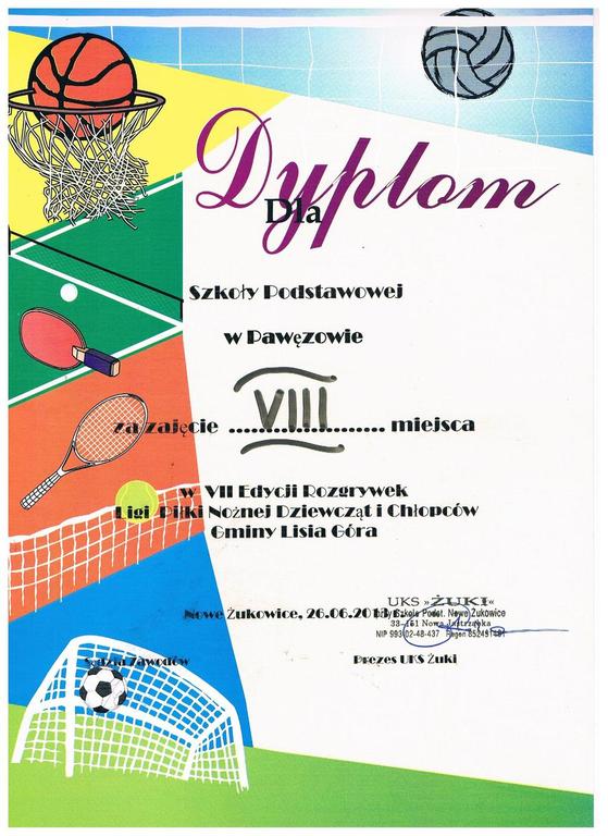 W tym roku po raz pierwszy uczniowie naszej szkoły klas I - III uczestniczyli w turnieju piłki nożnej dziewcząt i chłopców. Rozgrywki odbywały się raz w miesiącu od marca do czerwca. Zakończyły się w dniu dzisiejszym grilem i poczęstunkiem dla wszystkich uczestników. Uczniowie zajęli VIII miejsce w gminie. Drużyna otrzymała jednolite stroje od Stowarzyszenia Pawęzów Razem.